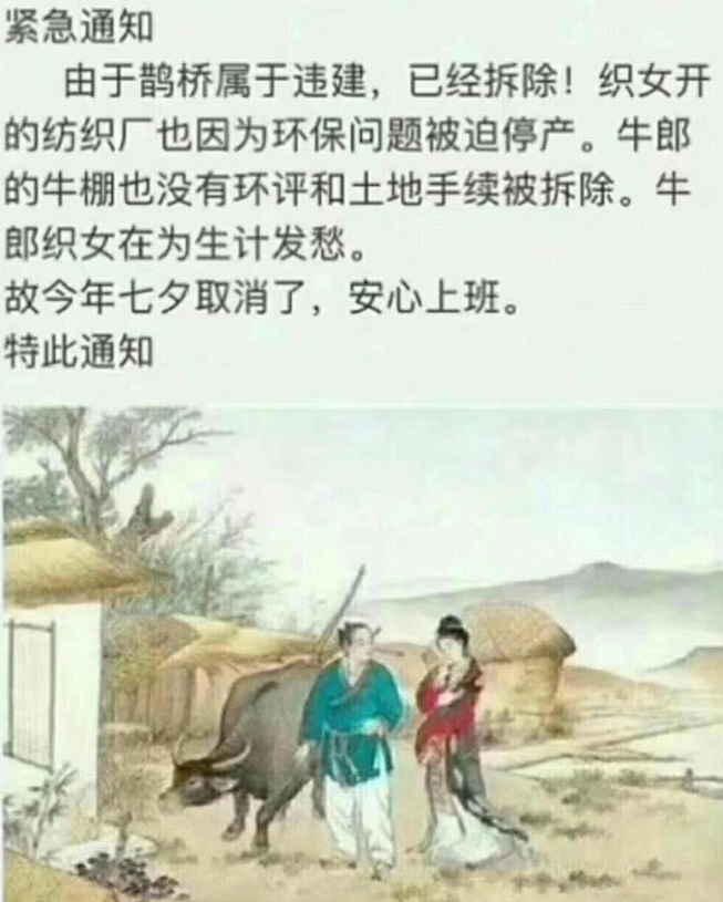 今天是所謂的“中國情人節(jié)”,農(nóng)歷七月初七,是七夕節(jié),又名乞巧節(jié)、七巧節(jié)、雙七、香日、星期、蘭夜、女兒節(jié) [1] 或七姐誕等。 “七夕”最早來源于人們對自然天象的崇拜。早在《詩經(jīng)》時代,人們就對牛郎織女的天象有所認(rèn)識,在東漢時就出現(xiàn)了人格化的描寫:“織女七夕當(dāng)渡河,使鵲為橋。”