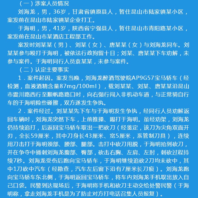 2018年8月27日21時(shí)30分許,劉海龍駕駛寶馬轎車(chē)在昆山市震川路西行至順?lè)仿房?,與同向騎自行車(chē)的于海明發(fā)生爭(zhēng)執(zhí)。劉海龍從車(chē)中取出一把砍刀連續(xù)擊打于海明,后被于海明反搶砍刀并捅刺、砍擊數(shù)刀,劉海龍身受重傷,經(jīng)搶救無(wú)效死亡。