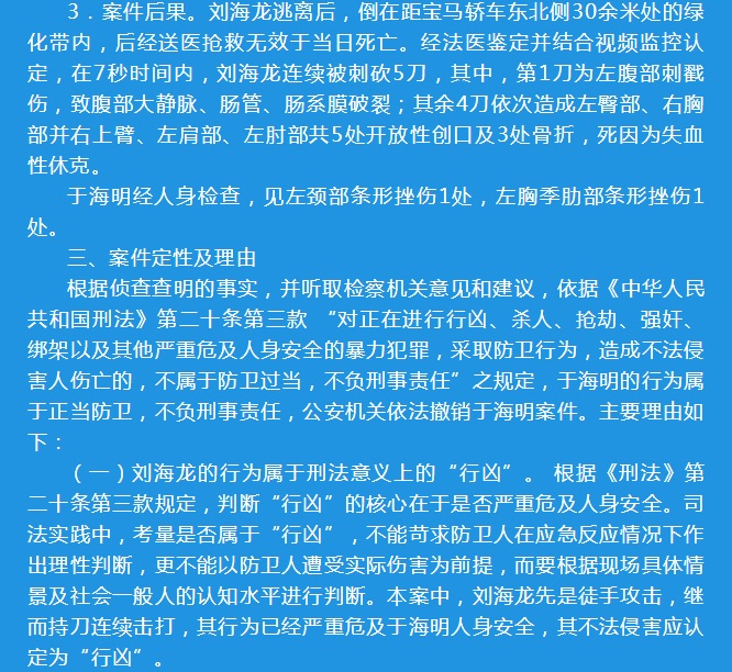 3。案件后果。劉海龍?zhí)与x后,倒在距寶馬轎車(chē)東北側(cè)30余米處的綠化帶內(nèi),后經(jīng)送醫(yī)搶救無(wú)效于當(dāng)日死亡。經(jīng)法醫(yī)鑒定并結(jié)合視頻監(jiān)控認(rèn)定,在7秒時(shí)間內(nèi),劉海龍連續(xù)被刺砍5刀,其中,第1刀為左腹部刺戳傷,致腹部大靜脈、腸管、腸系膜破裂;其余4刀依次造成左臀部、右胸部并右上臂、左肩部、左肘部共5處開(kāi)放性創(chuàng)口及3處骨折,死因?yàn)槭а孕菘恕?/FONT>