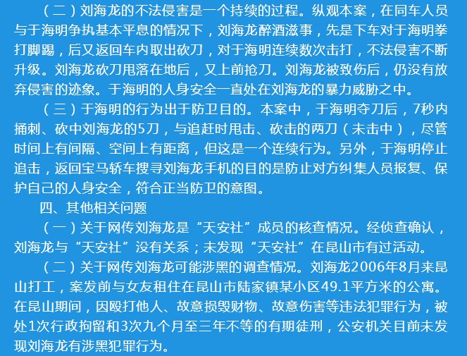 (一)關(guān)于網(wǎng)傳劉海龍是“天安社”成員的核查情況。經(jīng)偵查確認(rèn),劉海龍與“天安社”沒(méi)有關(guān)系;未發(fā)現(xiàn)“天安社”在昆山市有過(guò)活動(dòng)。