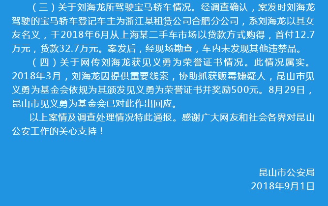 ?。ㄋ模╆P(guān)于網(wǎng)傳劉海龍獲見(jiàn)義勇為榮譽(yù)證書(shū)情況。此情況屬實(shí)。2018年3月,劉海龍因提供重要線索,協(xié)助抓獲販毒嫌疑人,昆山市見(jiàn)義勇為基金會(huì)依規(guī)為其頒發(fā)見(jiàn)義勇為榮譽(yù)證書(shū)并獎(jiǎng)勵(lì)500元。8月29日,昆山市見(jiàn)義勇為基金會(huì)已對(duì)此作出回應(yīng)。