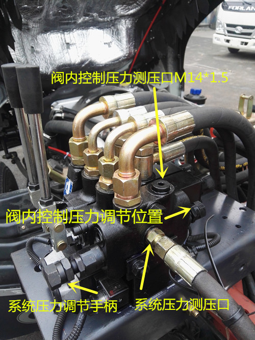 電控液壓多路閥的控制原理為:控制盒的電控制多路閥電磁鐵的移動(dòng),帶動(dòng)小油缸的移動(dòng)換向,用小油缸的移動(dòng)帶動(dòng)控制閥的換向大油缸動(dòng)作,達(dá)到閥芯的移動(dòng),實(shí)現(xiàn)多路閥的換向。閥內(nèi)控制油壓出廠時(shí)已調(diào)好成3Mpa,如發(fā)現(xiàn)電控時(shí),多路閥反應(yīng)遲后,不靈敏,則需要加大控制油壓,調(diào)壓方法基本相同,只是測(cè)壓口位置和調(diào)壓閥位置不同而已,位置見(jiàn)圖所示。