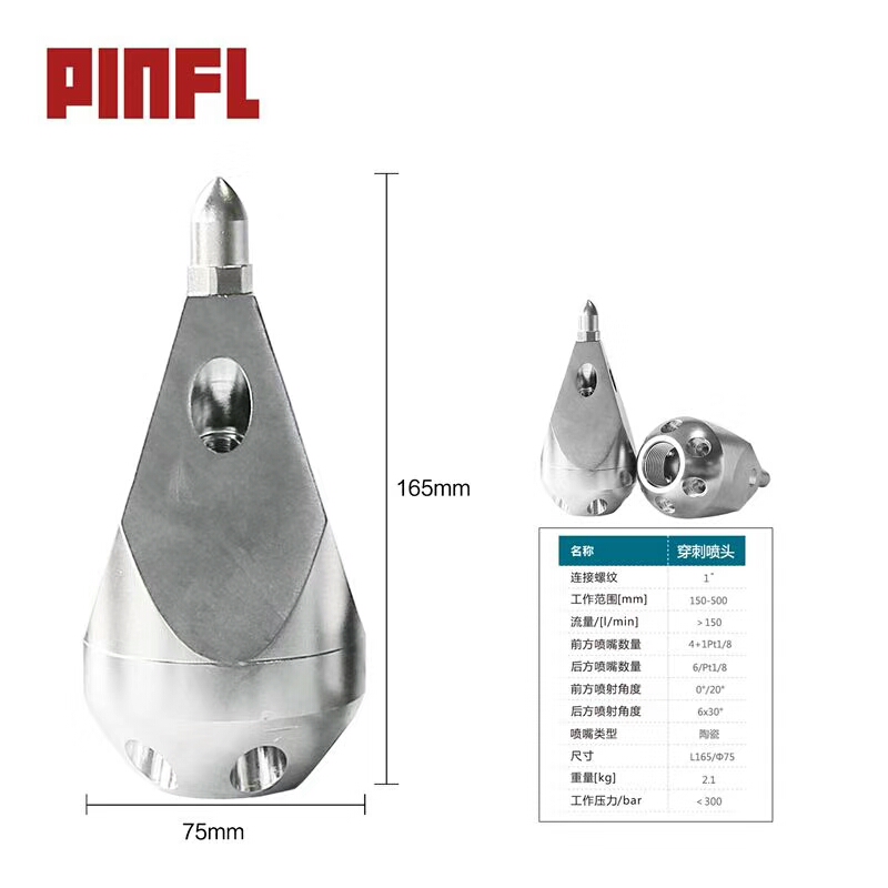 除了直噴頭以外,每個噴頭都有向后的6個噴射孔(一邊穿透、破碎、攪拌堵塞物,一邊推動噴頭和耐高壓水管前進(jìn)),其中2、3、5、8號另外,還有一個前噴孔(穿刺堵塞物并作為導(dǎo)引孔)。