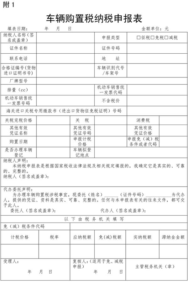 1.本表由車輛購置稅納稅人在辦理納(免、減)稅申報(bào)時(shí)填寫(打印),由納稅人簽章確認(rèn)。