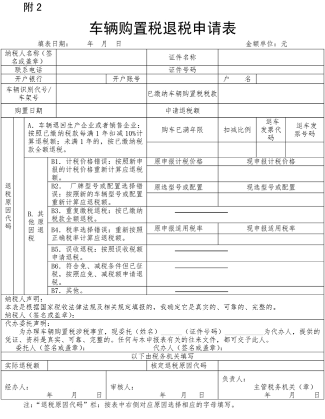 1.本表由車輛購置稅納稅人在辦理退稅申請(qǐng)時(shí)填寫(打印),由納稅人簽章確認(rèn)。