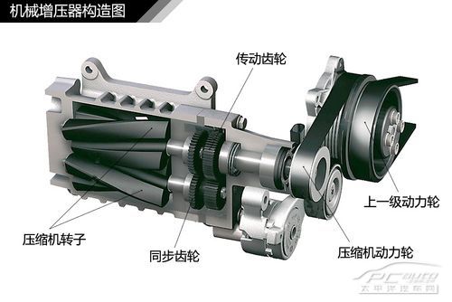 相對(duì)于渦輪增壓,機(jī)械增壓(Supercharger)的原理則有所不同。機(jī)械增壓主要是通過(guò)曲軸的動(dòng)力帶動(dòng)一個(gè)機(jī)械式的空氣壓縮機(jī)旋轉(zhuǎn)來(lái)壓縮空氣的。與渦輪增壓不同的是,機(jī)械增壓工作過(guò)程中會(huì)對(duì)發(fā)動(dòng)機(jī)輸出的動(dòng)力造成一定程度的損耗。