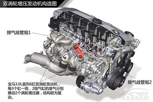針對(duì)廢氣渦輪增壓的渦輪遲滯現(xiàn)象,排氣管上并聯(lián)兩只同樣的渦輪(每三個(gè)缸一組連接一個(gè)渦輪增壓器),在發(fā)動(dòng)機(jī)低轉(zhuǎn)速的時(shí)候,較少的排氣即可驅(qū)動(dòng)渦輪高速旋轉(zhuǎn)以產(chǎn)生足夠的進(jìn)氣壓力,減小渦輪遲滯效應(yīng)。
