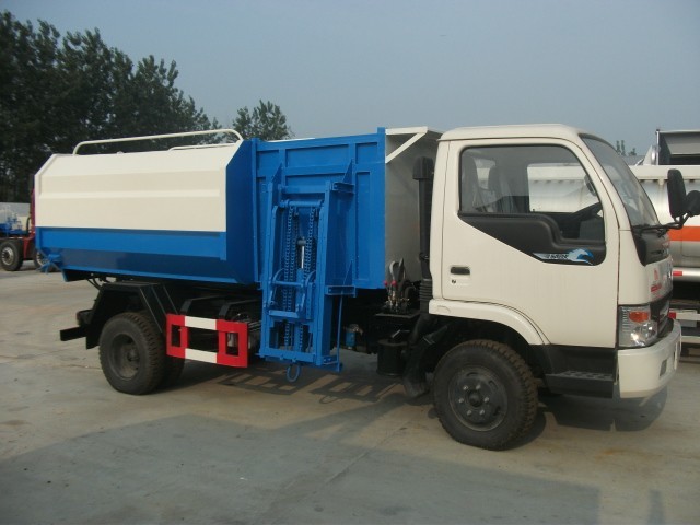 做掛桶式自裝卸垃圾車時垃圾斗容積為5立方米。垃圾箱頂部封閉,頂部前端開口裝上掛桶提升機構。這次根據(jù)客戶要求,采用液壓式自動提升翻轉機構,所有操作集成在駕駛室一次完成,不用下車操作。進一步簡化了操作流程。以下是此款車做成常規(guī)掛桶式自裝卸垃圾車時的照片: