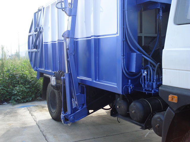 垃圾箱為自卸式設計。箱底同樣由自卸油缸控制。裝運完畢后將垃圾拉到垃圾場,倒車到指定位置后,在駕駛室啟動垃圾箱自卸裝置,箱底油缸開始舉升,垃圾箱整體被撐起,后蓋自動打開,垃圾可實現(xiàn)微殘留的完整自卸。