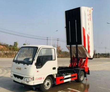 以往常見的自裝卸式垃圾車一般都是側掛桶帶箱體舉升。后高位翻轉的自裝卸式垃圾車最近幾年在垃圾分類/無滴漏等要求下開始逐步火爆。該車為后掛桶結構,自裝自卸。其"后高位翻轉"有兩個方面的含義,首先是垃圾桶高位翻轉:垃圾桶掛上后被提升機構水平端至箱體最高位置,然后翻轉將桶內垃圾倒入垃圾箱內。第二個也是最有特色的含義就是垃圾車的車廂的傾倒卸料,也是從車廂尾部高位為軸開始翻轉傾倒。因為車廂為船型結構,車廂沒有后門,全密封,不泄露,所以從高位翻轉傾倒。確保了整個收集/運輸過程無滴漏,非常適合收集轉運含水量較多的生活垃圾或者廚余垃圾,亦可作為餐廚垃圾車轉運餐廚垃圾。