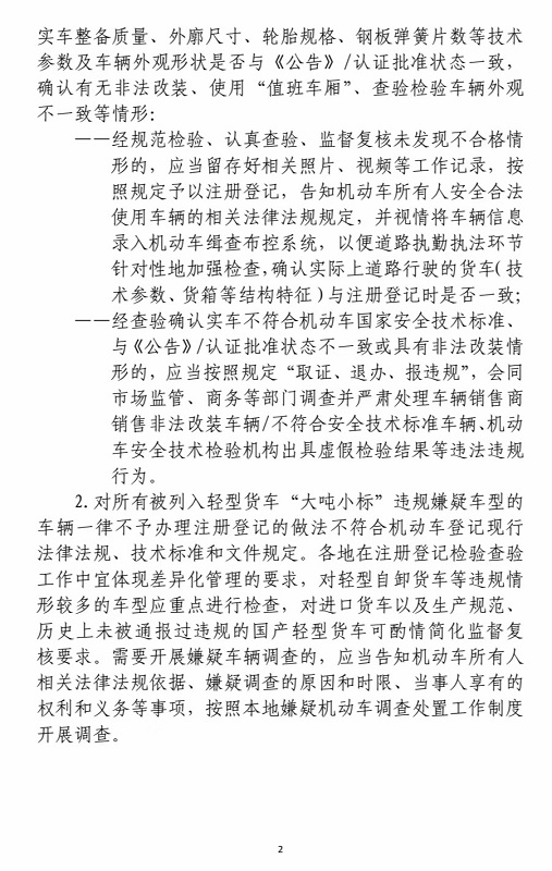 主要思想為嚴格按照合格證、公告參數(shù)、相關(guān)國標和實車查驗,針對列入涉嫌目錄的車型重點查驗,目錄內(nèi)的車型查驗結(jié)果合規(guī)的要正常辦理上牌手續(xù)。但是同時對于非法生產(chǎn)銷售違規(guī)車型的單位要嚴肅查處。