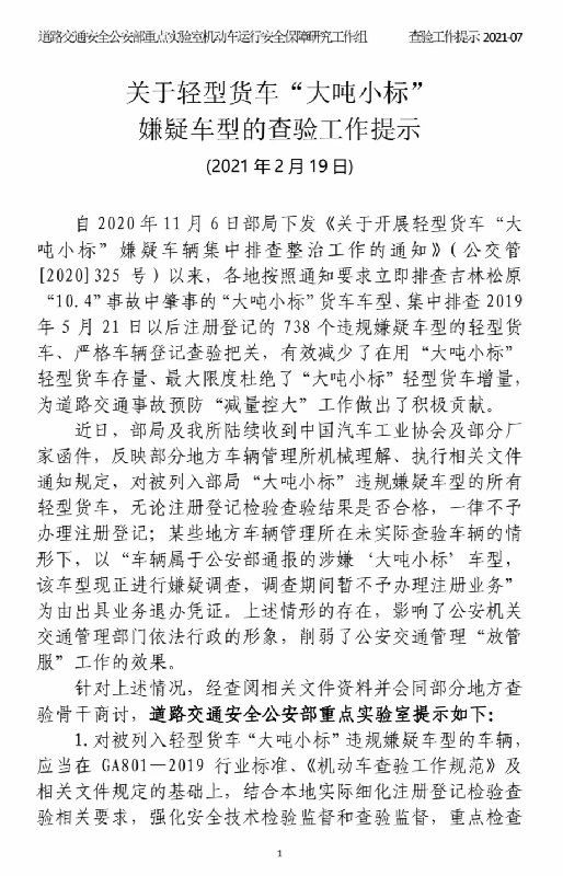 自2019年5.21日央視焦點訪談報道藍牌車超重超載起,近兩年來全國范圍針對藍牌車的政策越來越多,越來越嚴。各地也根據(jù)自己的實際情況制定了各種政策。將近兩年來藍牌車的生產(chǎn)和銷售也相對越來越規(guī)范,違規(guī)車越來越少,違規(guī)幅度也越來越小,上牌數(shù)量也急劇減少,“藍牌車”成了“難牌車”。工信部根據(jù)公告篩選了一部分參數(shù)值較大的車型列入涉嫌“大噸小標”違規(guī)車型目錄,但是實際上牌執(zhí)行過程中,部分地區(qū)車管所一刀切的對藍牌車拒絕辦理,或者直接退辦。怕?lián)?zé)任,不具體實際檢驗,屬于明顯的懶政,不作為。針對這一情況,為了進一步規(guī)范車輛上牌工作,道路交通安全公安部公安部重點實驗室機動車運行安全保障研究工作組于2021年2約19日發(fā)布了“查驗工作提示:2021-07--關(guān)于輕型貨車“大噸小標”嫌疑車型的查驗工作提示”,全文如下: