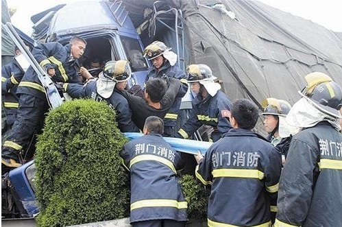 8點(diǎn)左右,荊門(mén)市消防支隊(duì)月亮湖中隊(duì)抵達(dá)事故現(xiàn)場(chǎng)。根據(jù)最早趕到現(xiàn)場(chǎng)的省高警荊門(mén)大隊(duì)民警提供的消息,除了先期救出的人員外,還有4人困在駕駛室內(nèi)。