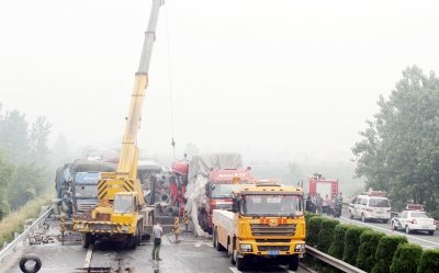 昨日清晨6時(shí)許,漢十高速云夢(mèng)東入口處三輛大貨車(chē)大霧中連環(huán)相撞,造成司乘人員一死一傷。