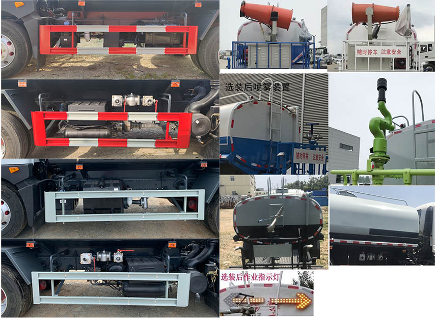 整車備注:1.該車主要用于城鄉(xiāng)園林綠化灑水;主要專用裝置為噴灑總成;罐體有效容積11.88立方米;2.隨底盤選裝同系列的高頂駕駛室,選裝不同外形管道,選裝風(fēng)機(jī)樣式,選裝高射炮樣式,選裝后噴霧,選裝左側(cè)噴灑,選裝右側(cè)噴灑,選裝后平臺樣式,選裝LED箭頭指示燈,選裝右側(cè)管道;3.整車長度/軸距/罐體外形尺寸(長×長軸×短軸)的對應(yīng)關(guān)系為(mm):8460/4500/(5150×2350×1450,4700×2400×1550),7910/3950/(4700×2400×1550);4.側(cè)防護(hù),后防護(hù)材料為Q235;連接方式:焊接加螺栓連接,后部防護(hù)裝置斷面尺寸(寬×高)60×120(mm),后部防護(hù)離地高度:450mm;5.ABS系統(tǒng)控制器型號/廠家:J ABS/焦作博瑞克控制技術(shù)有限公司